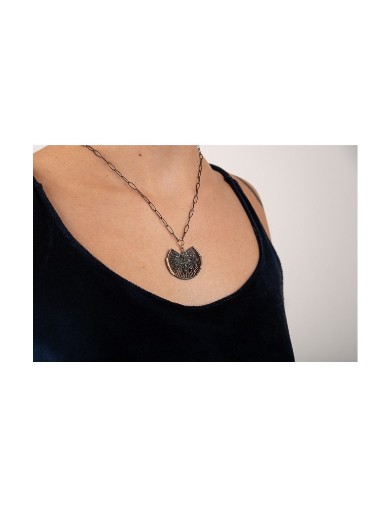Μενταγιόν κατασκευασμένο απο ασήμι 925, με ιδιαίτερη σμίλευση, οξειδωμένο, χρυσά στοιχεία 18 καρατίων και ένα ρουμπίνι.