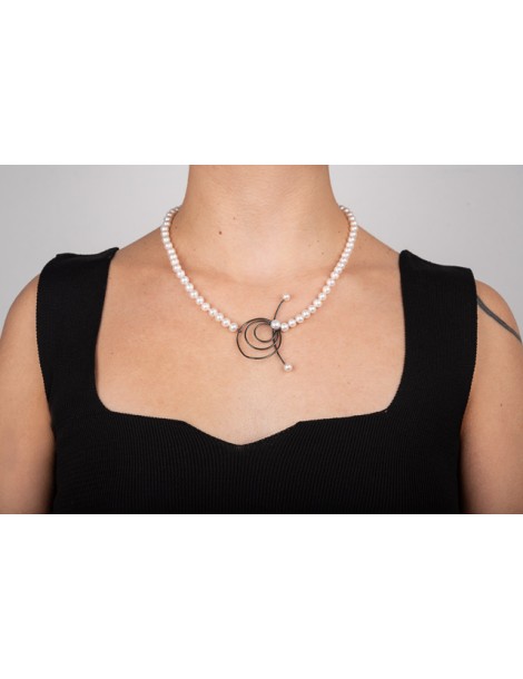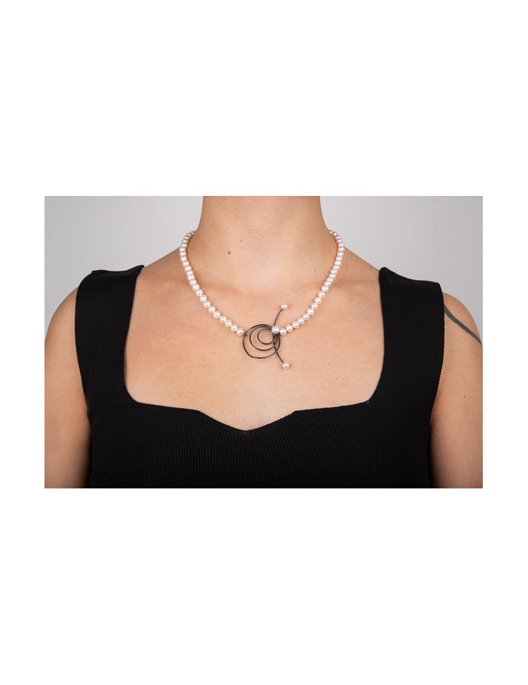 Κολιέ για τον λαιμό με πολλά λευκά μαργαριτάρια του γλυκού νερού και επιροδιωμένο ασημένιο θέμα που τυγχάνει να είναι και το κούμπωμα του.