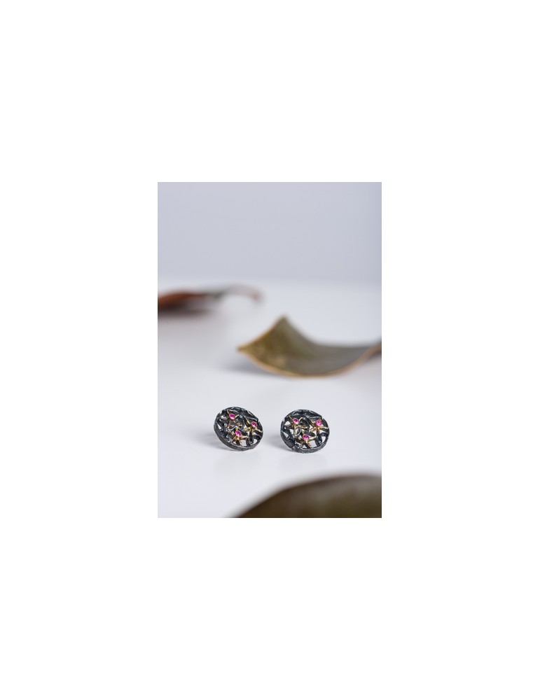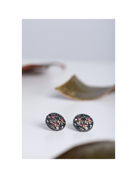 Σκουλαρίκια κατασκευασμένα απο ασήμι 925, με ιδιαίτερη σμίλευση, οξειδωμένα, χρυσά στοιχεία 18 καρατίων και τρία ρουμπίνια σε κάθε σκουλαρίκι.