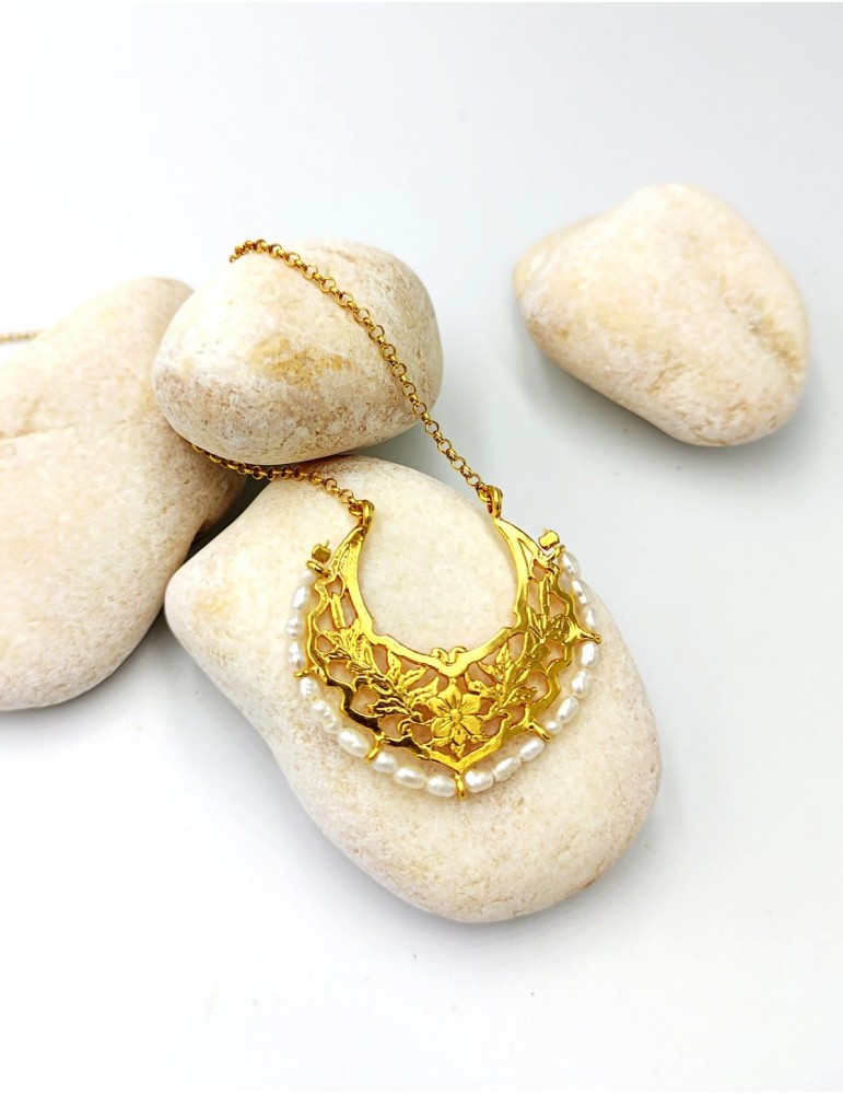 Ασημένιο επίχρυσο Μενταγιόν με λευκά μαργαριταράκια του γλυκού νερού. Δημιουργία του Νικόλα Σιδηρόπουλου.