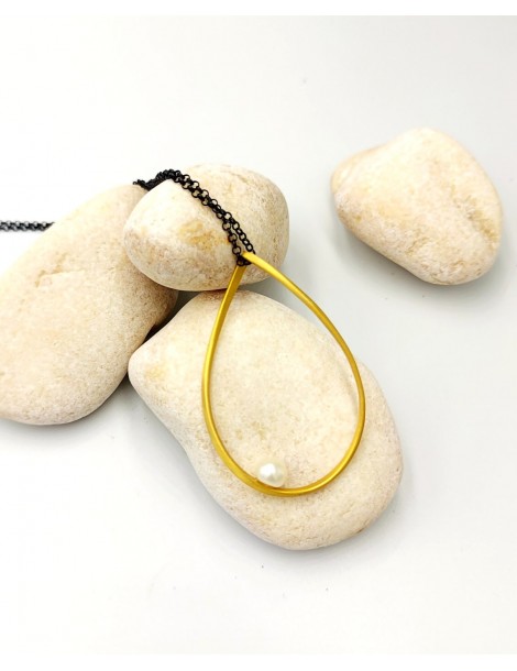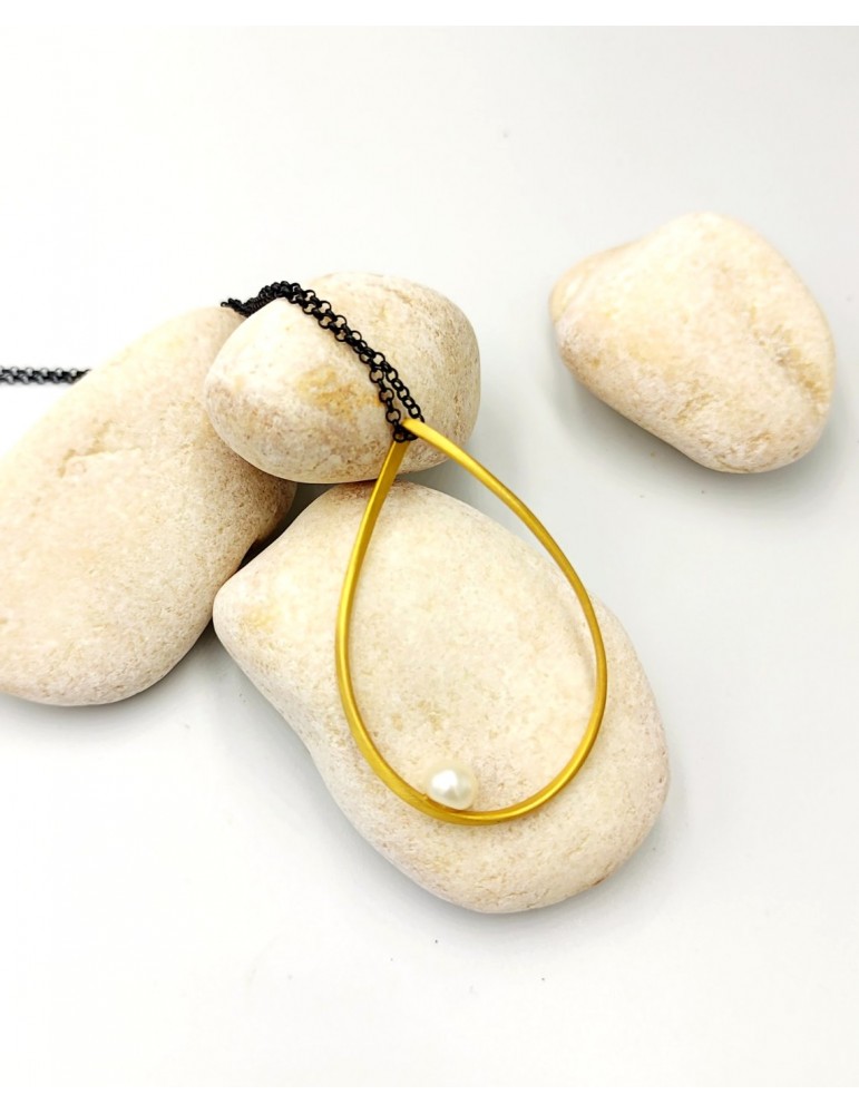 Ασημένιο Επίχρυσο Μενταγιόν (ασήμι 925) με ένα λευκό μαργαριτάρι του γλυκού νερού. Μάυρη ασημένια οξειδωμένη αλυσιδα 50 εκατοστών.