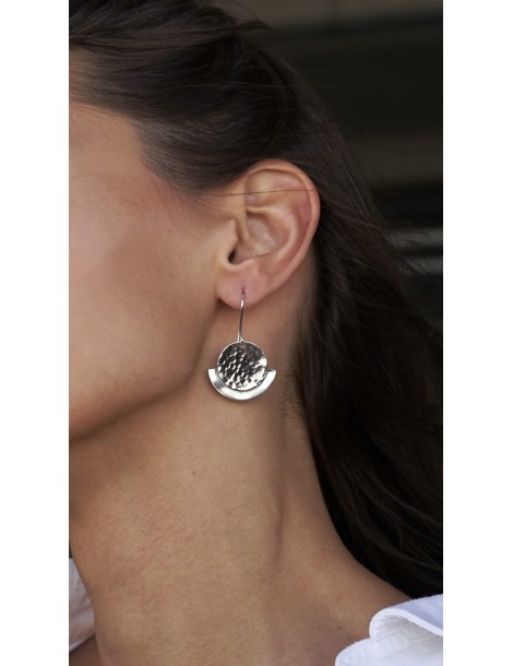 Ασημένια σφυρήλατα Σκουλαρίκια. Μοντέρνος σχεδιασμός. Η λάμψη και η σφυρηλάτηση δίνουν μια αίσθηση κίνησης στο κόσμημα. Συνδυάζεται εύκολα και η χρήση του μπορεί να είναι πολλαπλή.