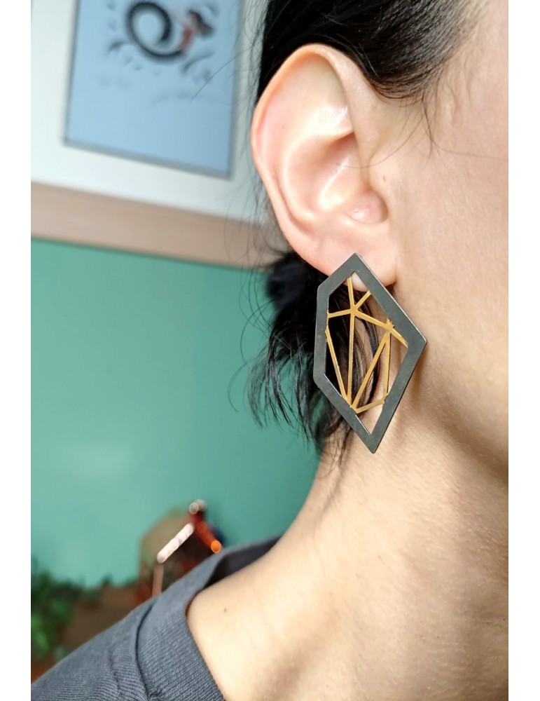 Μοντέρνα γεωμετρικά Σκουλαρίκια απο Μπρούντζο με μαύρη και χρυσή επιμετάλωση. Η χρήση τους είναι απο πολύπλευρη. Δημιουργία απο Maya Jewels.