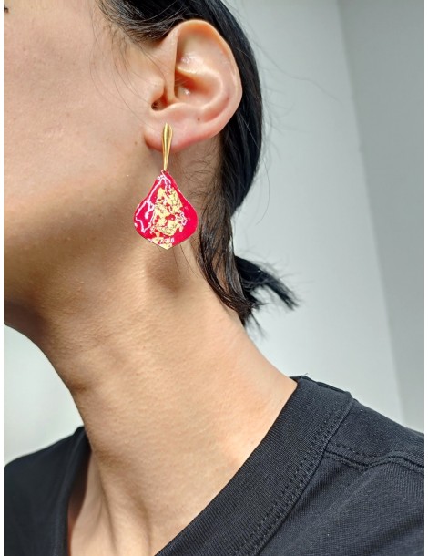 Έθνικ Σκουλαρίκια με κόκκινο Σμάλτο. Το κόσμημα έχει σκέλη απο ορείχαλκο και ασήμι. Επίσης είναι επίχρυσο και το κυρίως μέρος και κεντρικά επι του σμάλτου. Δημιουργια του Γιώργου Παυλίδη.