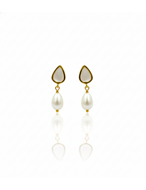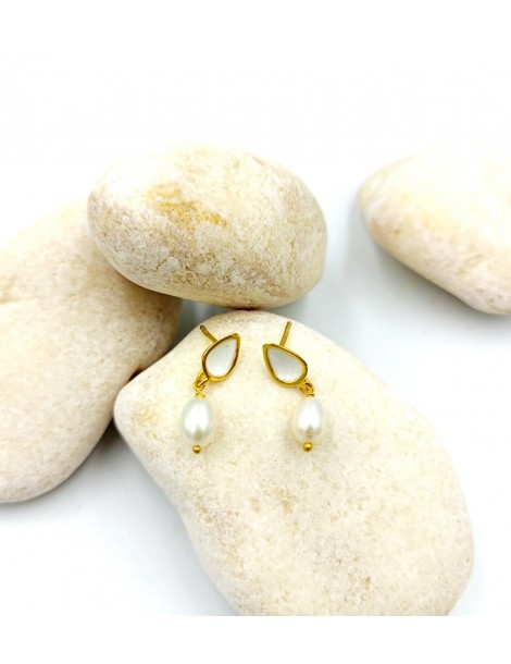 Ασημένια σκουλαρίκια (ασήμι 925) με επιχρύσωμα χρώματος 24 καρατίων χρυσού, λευκό μαργαριτάρι του γλυκού νερού. Καρφώνουν στο αυτί και κρέμονται ελαφρώς.
