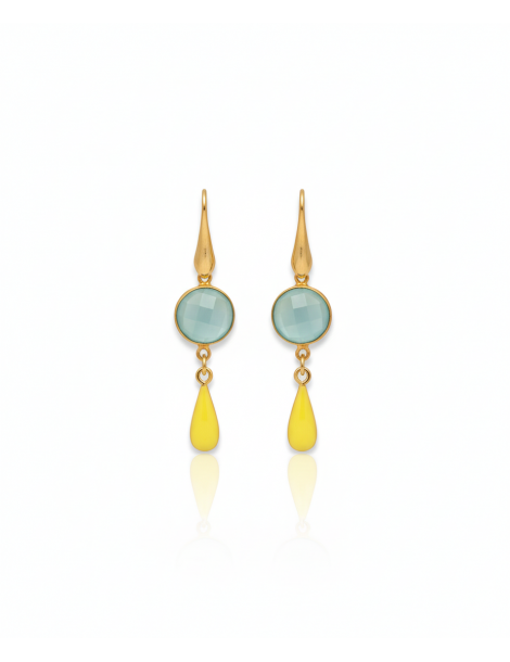 Ασήμι 925, επιχρυσωμένο σε χρώμα χρυσού 24Κ, κίτρινος θερμός σμάλτος και γαλάζιος ορυκτός κρύσταλλος. Με γάντζακι, κρεμαστά.