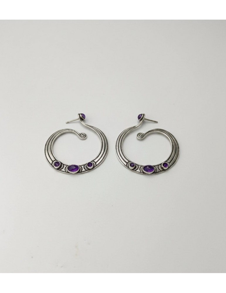 Ασημένια περίτεχνα κρεμαστά Σκουλαρίκια με 3 ημιπολύτιμες πέτρες (Αμέθυστος). Δημιουργία της οικογένειας Σπύρου Κούκου με μακρά παράδοση στην αργυροχοοία.