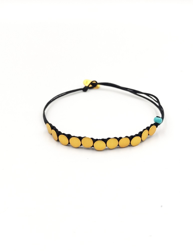 Βραχιόλι με κορδόνι και 11 επιχρυσωμένα στοιχεία καθώς και ενα μικρό τυρκοάζ χαντράκι.