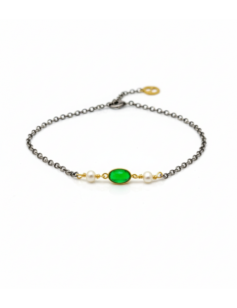 Silver Bracelet with white freshwater pearls and green mineral Crystal.