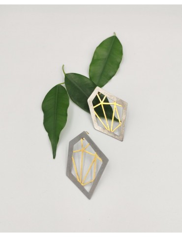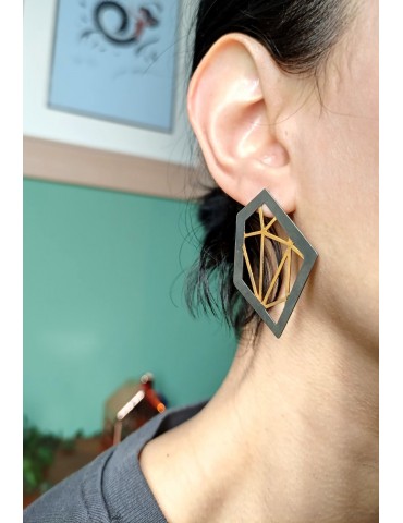 Modern geometrical Brass earrings. Goldplated and blackplated. The part that touches the ear is made by sterling silver.