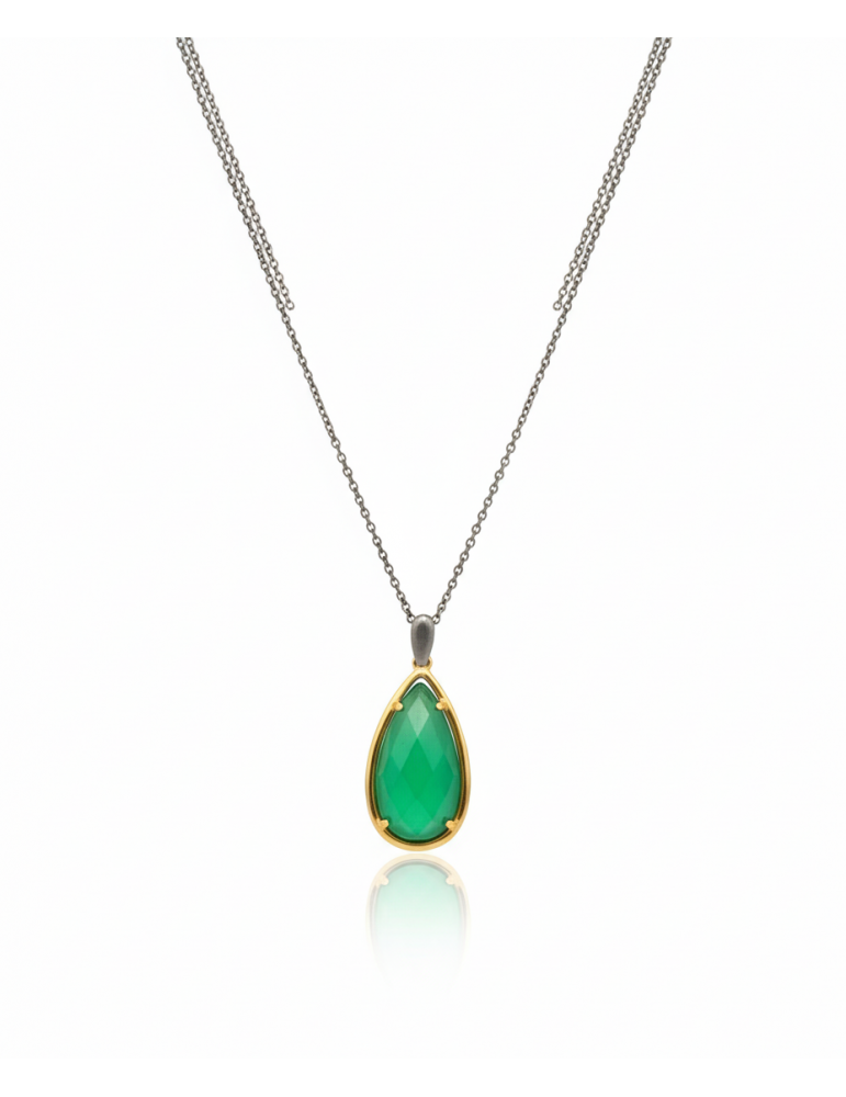 Gold and blackplated silver parts, green mineral Crystal and blackplated silver chain.